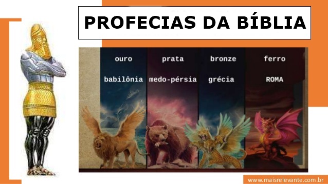 R.: “A cabeça daquela estátua era de ouro fino; o seu peito e os seus braços de prata; o seu ventre e as suas coxas de cobre. As pernas de ferro; os seus pés em parte de ferro e em parte de barro”. Daniel 2:32-33